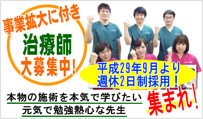 私たちがしっかりとフォロー致します!資格 ① 20歳~30歳位まで 柔道整復師資格、お持ちの方。 経験者優遇致します。 給与 ①社員は月給、基本給(当社規定による)